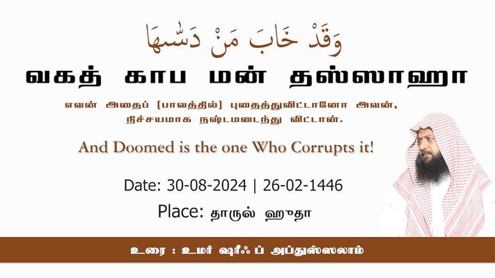 ஆன்மாவை புதைப்பது என்றால் என்ன? அல்லாஹ் தடுத்த பாவத்தை செய்வது. அல்லாஹ் வெறுத்த காரியத்தை செய்வது. அது கொள்கையாக இருக்கட்டும், குணங்களாக இருக்கட்டும், செயல்களாக இருக்கட்டும்.